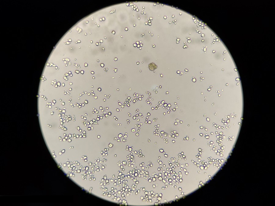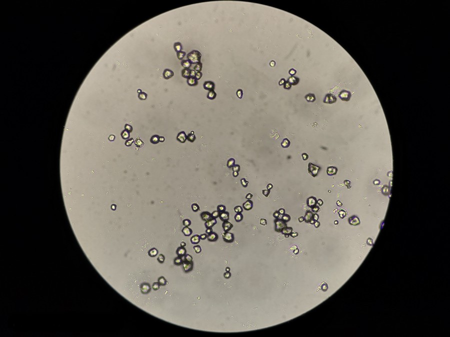 使用生物顯微鏡ML31進(jìn)行明場(chǎng)鏡檢,可見(jiàn)很多顆粒,少量雜質(zhì),可能是殘留的草藥植物纖維,也可能是玻片或者水本身帶的雜質(zhì)。