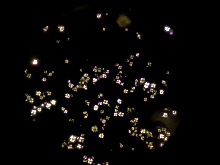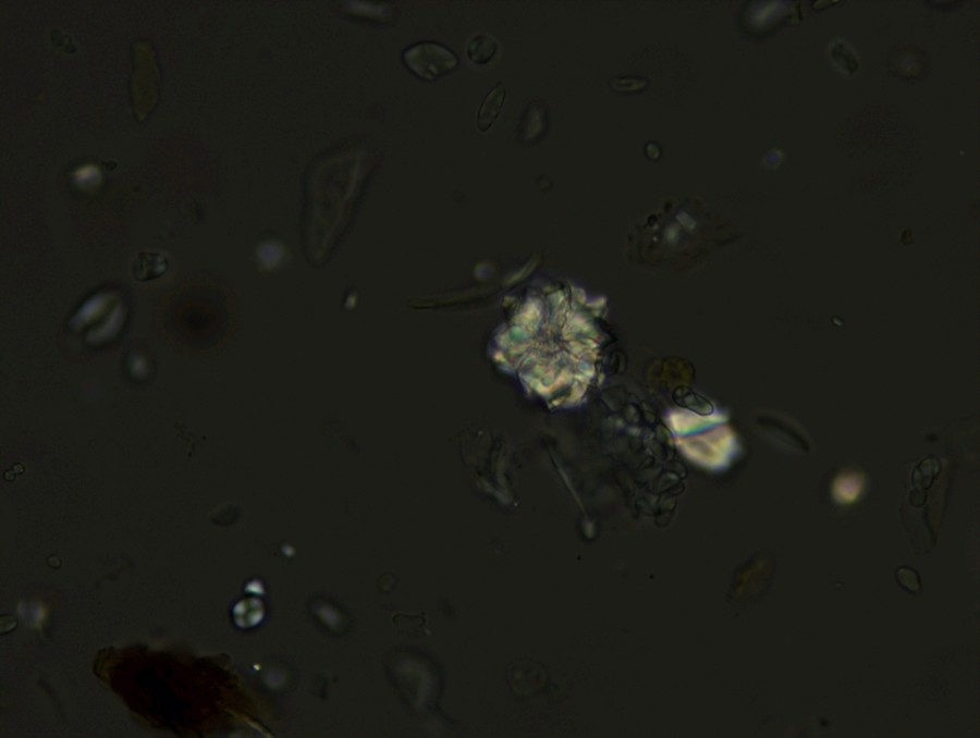 在其他視野中,我們也看到了一些其他偏光反應(yīng),可能是草酸鈣簇晶之類成分,也可能是玻片或者水中的雜質(zhì)。