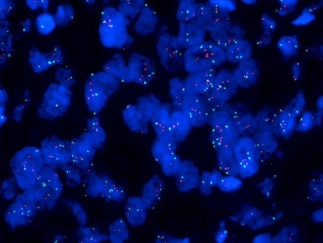 ①組織切片以HER2常規(guī)石蠟包埋組織切片為例,新鮮樣本取材后經(jīng)過固定、水洗、脫水、透明、浸蠟、包埋、切片和烘烤制備成常規(guī)切片,過程中特別注意固定和切片,樣品厚度保持在3-5um最佳。染色可分為預(yù)處理、雜交、洗滌、復(fù)染四步,尤其注意預(yù)處理的脫蠟、煮片、酶消化,以及雜交中的變性(加熒光探針)。