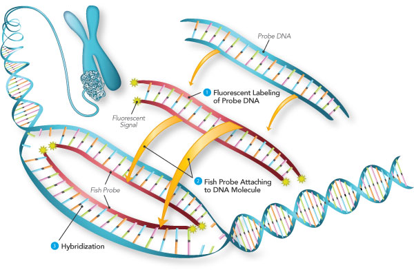 FISH樣品在紫外激發(fā)光的照射在,顯現(xiàn)出藍(lán)色的細(xì)胞輪廓的信號(hào),在藍(lán)色激發(fā)光的照射下在細(xì)胞內(nèi)顯現(xiàn)出綠色的探針信號(hào),在綠色激發(fā)光的照射下在細(xì)胞內(nèi)顯現(xiàn)出紅色的探針信號(hào)。