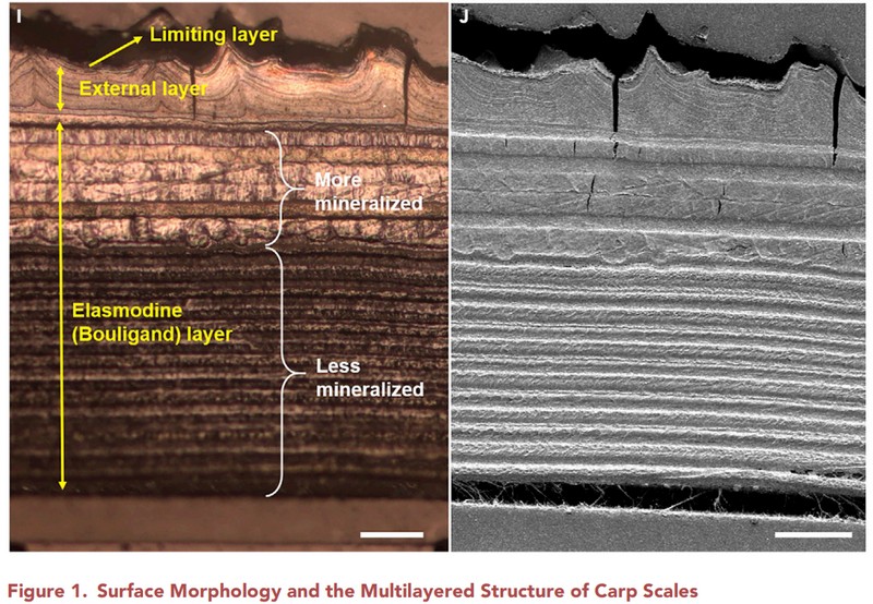 ②Haocheng Quan, Wen Yang, Marine Lapeyriere, Eric Schaible, Robert O. Ritchie, Marc A. Meyers,Structure and Mechanical Adaptability of a Modern Elasmoid Fish Scale from the Common Carp,Matter,Volume 3, Issue 3,2020,Pages 842-863,ISSN 2590-2385,https://doi.org/10.1016/j.matt.2020.05.011.