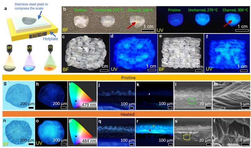加熱會(huì)改變魚(yú)鱗的光學(xué)特性,那么加熱到多少、加熱多久合適呢?研究人員使用兩片不銹鋼壓平魚(yú)鱗,然后放到高溫?zé)崤_(tái)上進(jìn)行恒溫加熱3分鐘,再放到熒光顯微鏡下觀察。在熒光顯微鏡U激發(fā)下,可以看到未加工的魚(yú)鱗也有藍(lán)色的弱熒光激發(fā),加熱到270℃后的魚(yú)鱗熒光會(huì)增強(qiáng),強(qiáng)度與未加工魚(yú)鱗有顯著差別,且在明場(chǎng)下看不出與未加工魚(yú)鱗的區(qū)別;加熱到300℃熒光還會(huì)增強(qiáng),但魚(yú)鱗本身會(huì)碳化,變得容易脆斷。