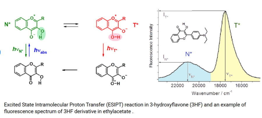 激發(fā)態(tài)高能量下熒光團(tuán)化學(xué)結(jié)構(gòu)出現(xiàn)結(jié)構(gòu)破壞,改變熒光特性,這種現(xiàn)象稱為激發(fā)態(tài)分子內(nèi)質(zhì)子轉(zhuǎn)移ESIPT,可以理解為2的質(zhì)子轉(zhuǎn)移版本。