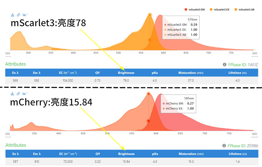 mScarlet3亮度是mCherry 5倍左右,壽命3倍以上