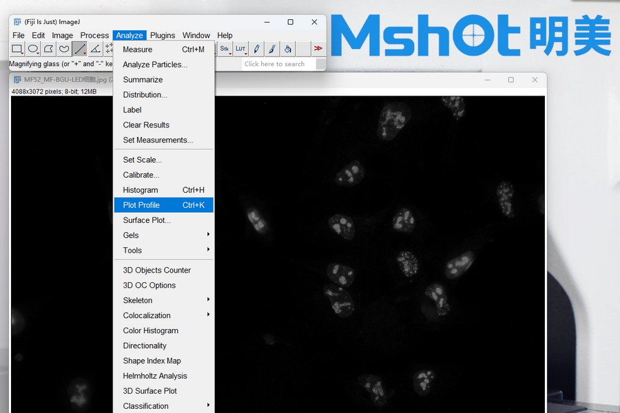 熒光強(qiáng)度分析是論文常用技能之一,它可以量化熒光強(qiáng)度,從而進(jìn)行對(duì)比分析或統(tǒng)計(jì)分析,得出可信的結(jié)果。今天我們就來(lái)介紹下如何用明美顯微數(shù)碼測(cè)量分析系統(tǒng)和ImageJ快速實(shí)現(xiàn)徑向熒光強(qiáng)度分析。