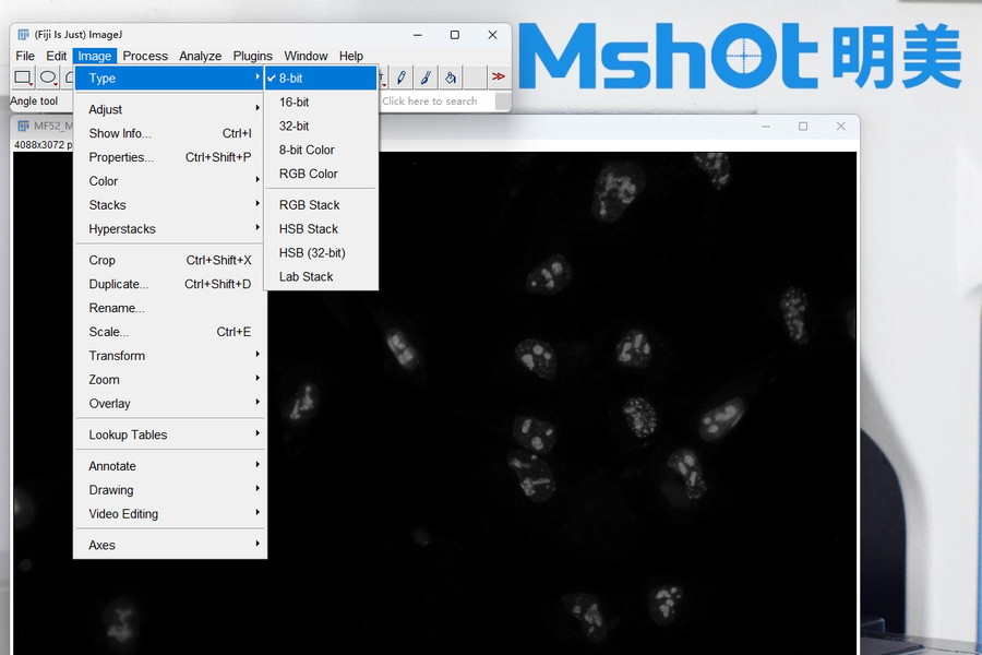 我們這個(gè)熒光圖是單色熒光,因此我們這里先將其轉(zhuǎn)化成8bit格式,減少其他通道信號(hào)可能帶來(lái)的問(wèn)題,在菜單選項(xiàng)選擇Image-Type-8bit.