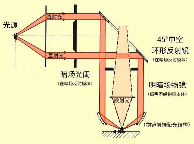 反射暗場光路原理跟透射暗場光路一致,只是結(jié)構(gòu)有些變化,除了多了個(gè)環(huán)形反射鏡產(chǎn)生反射照明,其物鏡前端也有特殊的反射結(jié)構(gòu)來反射聚光,這種物鏡就是BD明暗場物鏡。