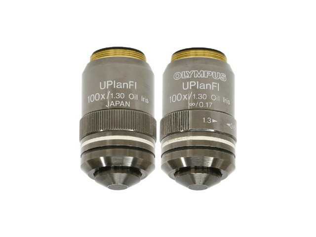 原則上,透射的暗場觀察無需特別的暗場物鏡,直接用普通物鏡即可。例外情況是100X物鏡,由于100X物鏡的N.A起碼都有1.25,而暗場照明要求照明N.A顯著大于物鏡N.A,因此連上述的U-DCW油浸式暗場聚光鏡都帶不動(dòng)一個(gè)普通Plan 100X. 為了滿足暗場使用,部分100X物鏡會(huì)加入可變光闌,用來降低物鏡N.A,以匹配暗場聚光鏡N.A.