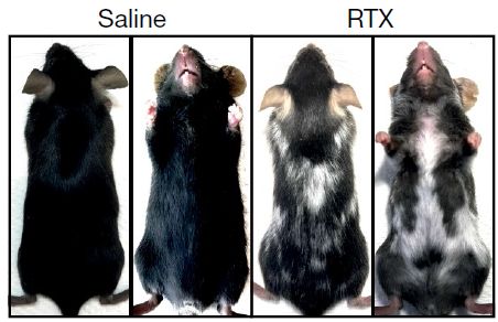 在三組中,用辣椒素類似物——樹脂毒素(通過痛覺誘導(dǎo)壓力產(chǎn)生)誘導(dǎo)的壓力組小鼠是出現(xiàn)白色毛發(fā)迅速明顯的,在注射后的下一個毛發(fā)生長周期中就長出了不少白色毛發(fā),另外兩組則用了3-5個周期才達到這種效果。這也說明,無論是什么形式的壓力,都會導(dǎo)致白色毛發(fā)的產(chǎn)生。